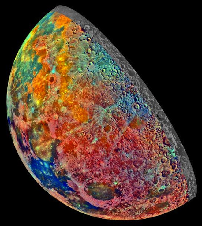 In 1992, the Jupiter-bound Galileo spacecraft made a pass by our planet’s closest companion, the moon. This mosaic of 53 images shows the different composition of rocks on the moon’s surface. Blue and orange colors represent lava flows, bright pink areas are highlands, and light blue colors indicate recent impact material with the youngest craters showing blue rays extending away from them.