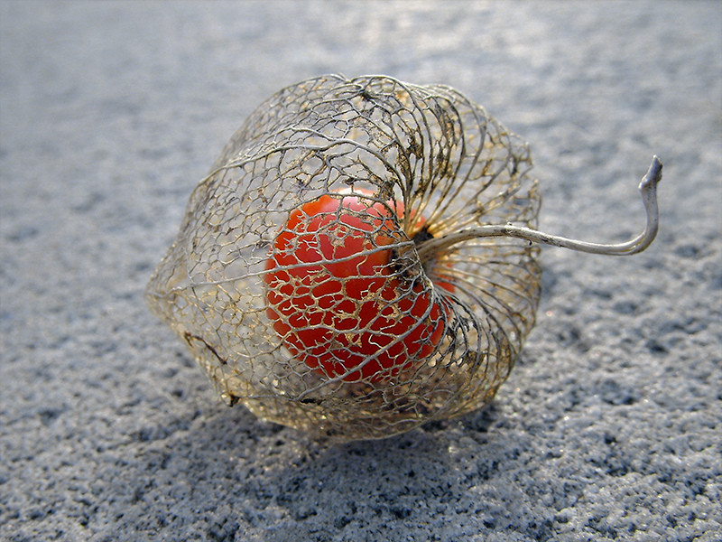 Physalis alkekengi, or the Chinese/Japanese Lantern, blooms during Winter and dries during Spring. Once it is dried, the bright red fruit is seen. The outer cover is a thin mesh that held the flower petals, seen in golden brown colour.