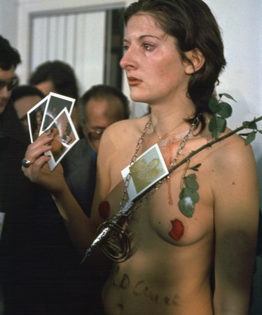 “This piece was primarily a trust exercise, in which she told viewers she would not move for six hours no matter what they did to her. She placed 72 objects one could use in pleasing or destructive ways, ranging from flowers and a feather boa to a knife and a loaded pistol, on a table near her and invited the viewers to use them on her however they wanted.