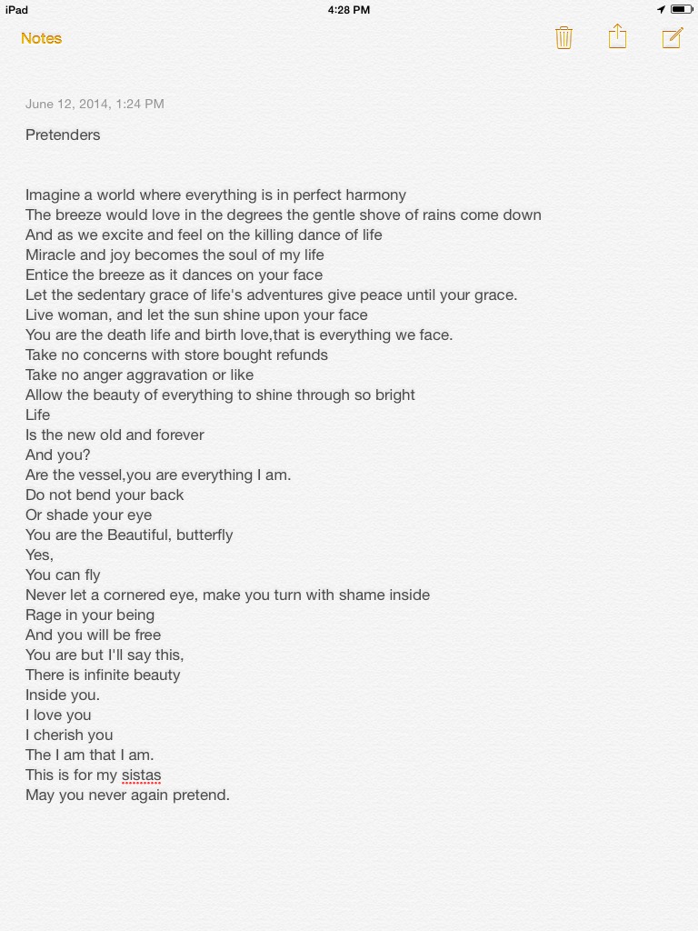 June 12, 2014February 7, 2017 Ama Rose A dose of poetry ๐ Share this: Share on X (Opens in new window) X Share on Facebook (Opens in new window) Facebook Share on Tumblr (Opens in new window) Tumblr Like Loading... Related