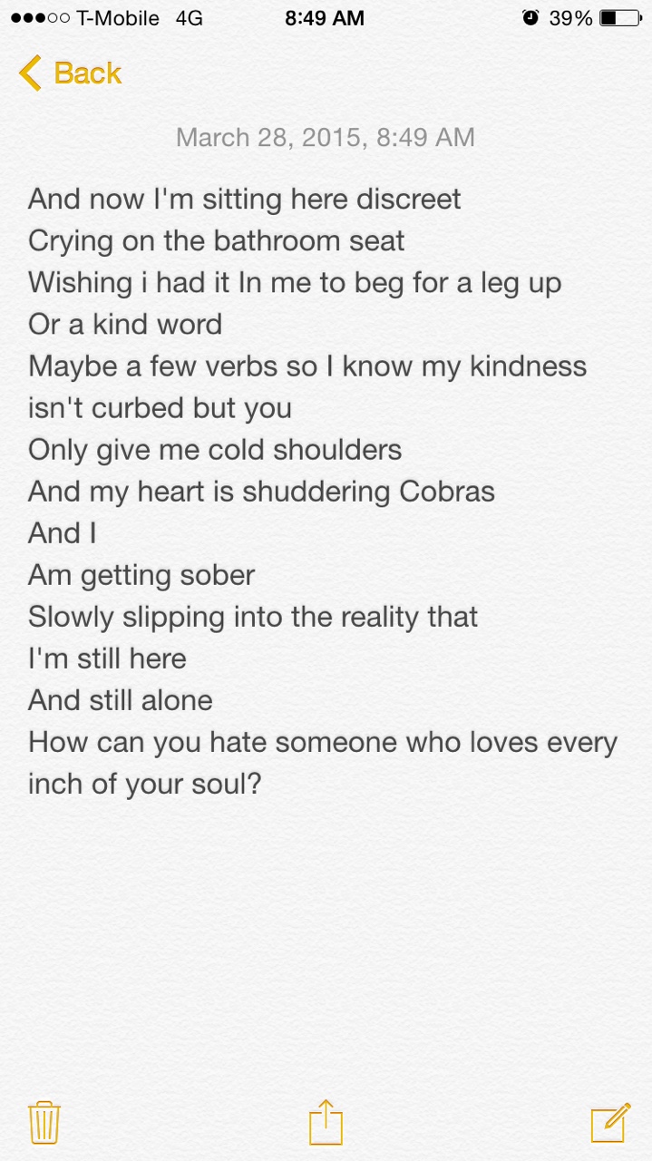 March 28, 2015January 2, 2021 Ama Rose Hard morning only took a minute to manifest.-poem Share this: Share on X (Opens in new window) X Share on Facebook (Opens in new window) Facebook Share on Tumblr (Opens in new window) Tumblr Like Loading... Related