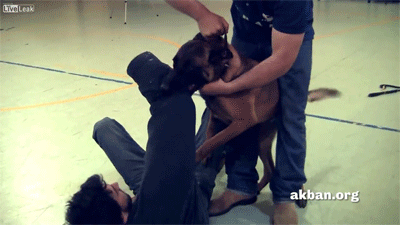 This dog is a not just any dog – it’s a Belgian Malinois. They are often used as guard and attack dogs because they have EXTREMELY high drive, an exceptional work ethic, and are widely considered the best working dogs for military and police forces. The pup above is well-trained and yes – he absolutely LOVES his job.